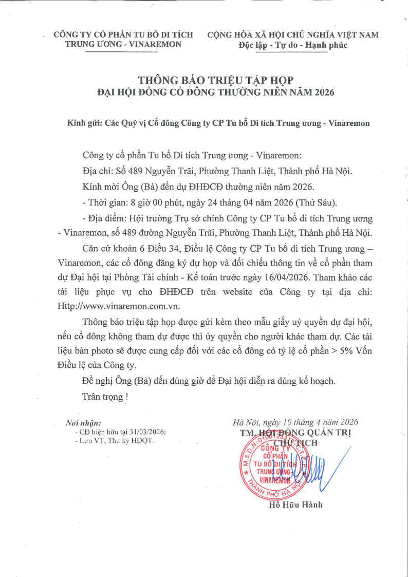 THÔNG BÁO TRIỆU TẬP HỌP ĐẠI HỘI ĐỒNG CỔ ĐÔNG THƯỜNG NIÊN NĂM 2026